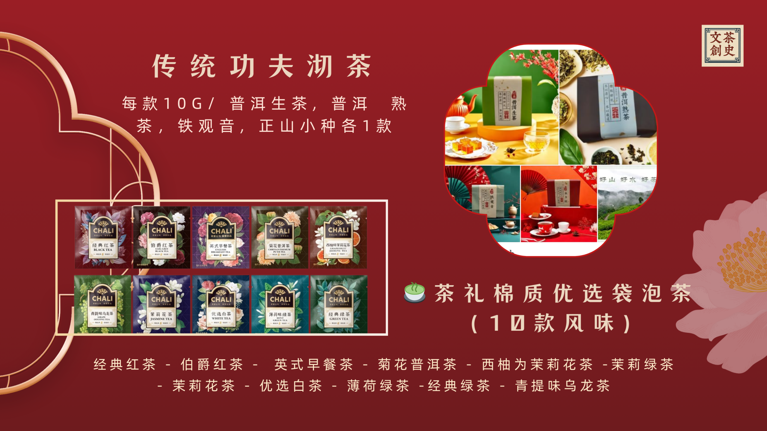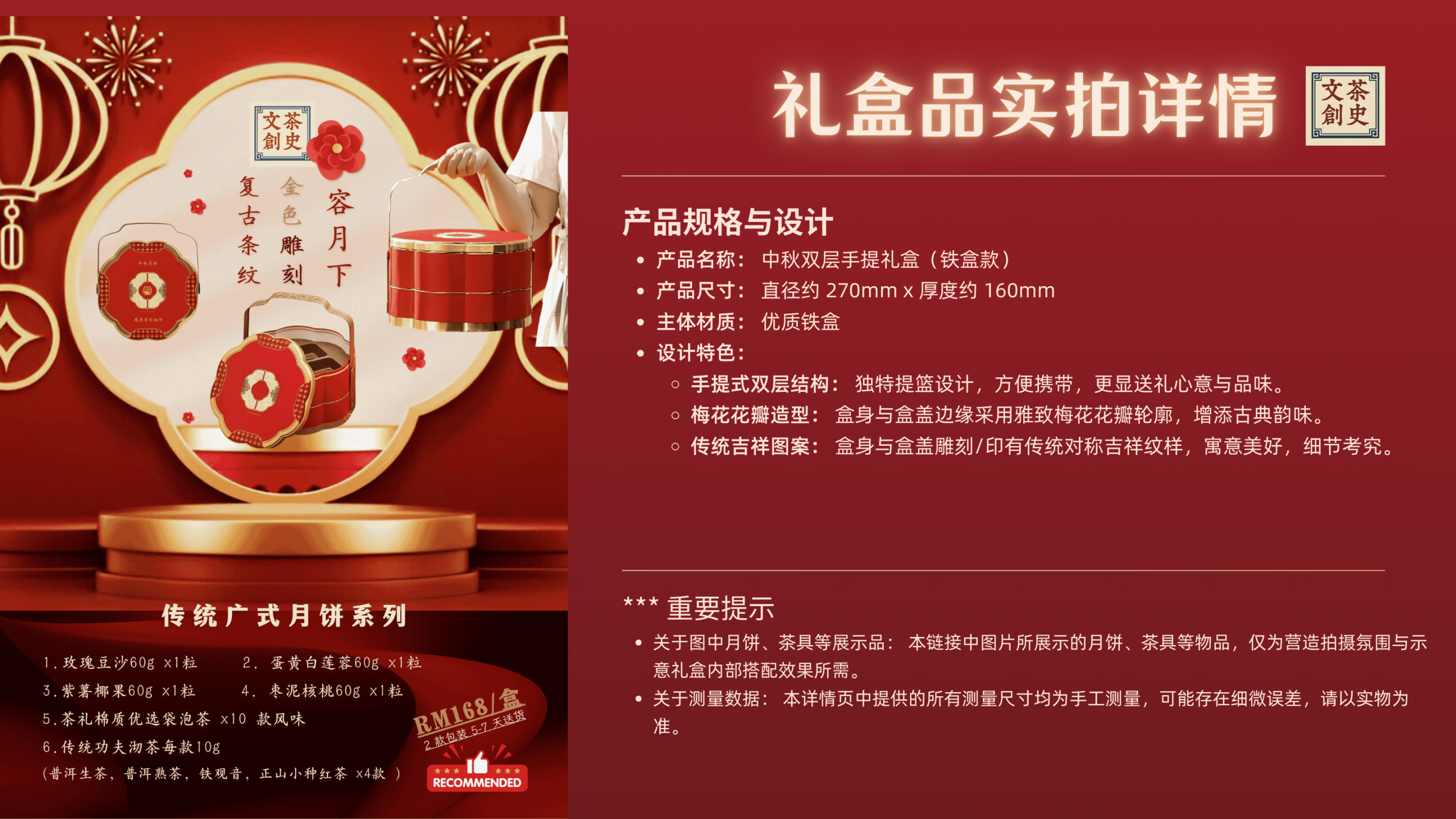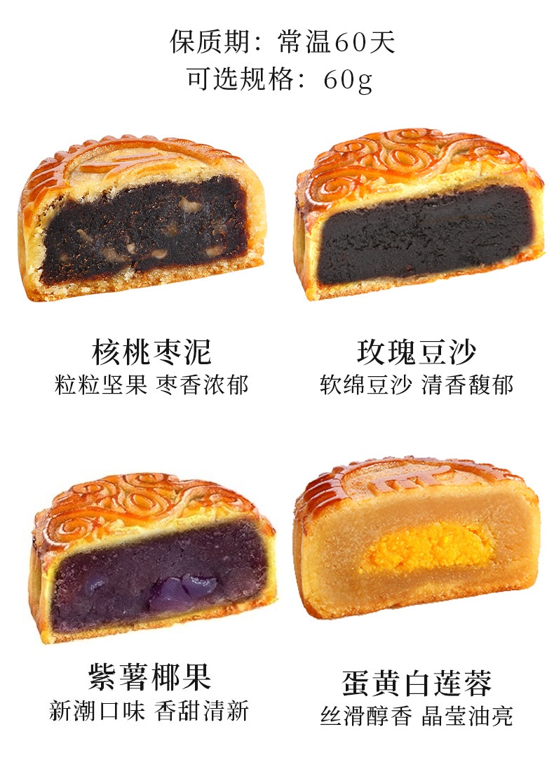 传统广式月饼系列 * 玫瑰豆沙 60g x1 粒 * 蛋黄白莲蓉 60g x1 粒 * 紫薯椰果 60g x1 粒 * 枣泥核桃 60g x1 粒 * 茶礼棉质优选袋泡茶 x10 款风味 * 传统功夫茶每款 10g(普洱生茶,普洱熟茶,铁观音,正山小种红茶 x4 款)