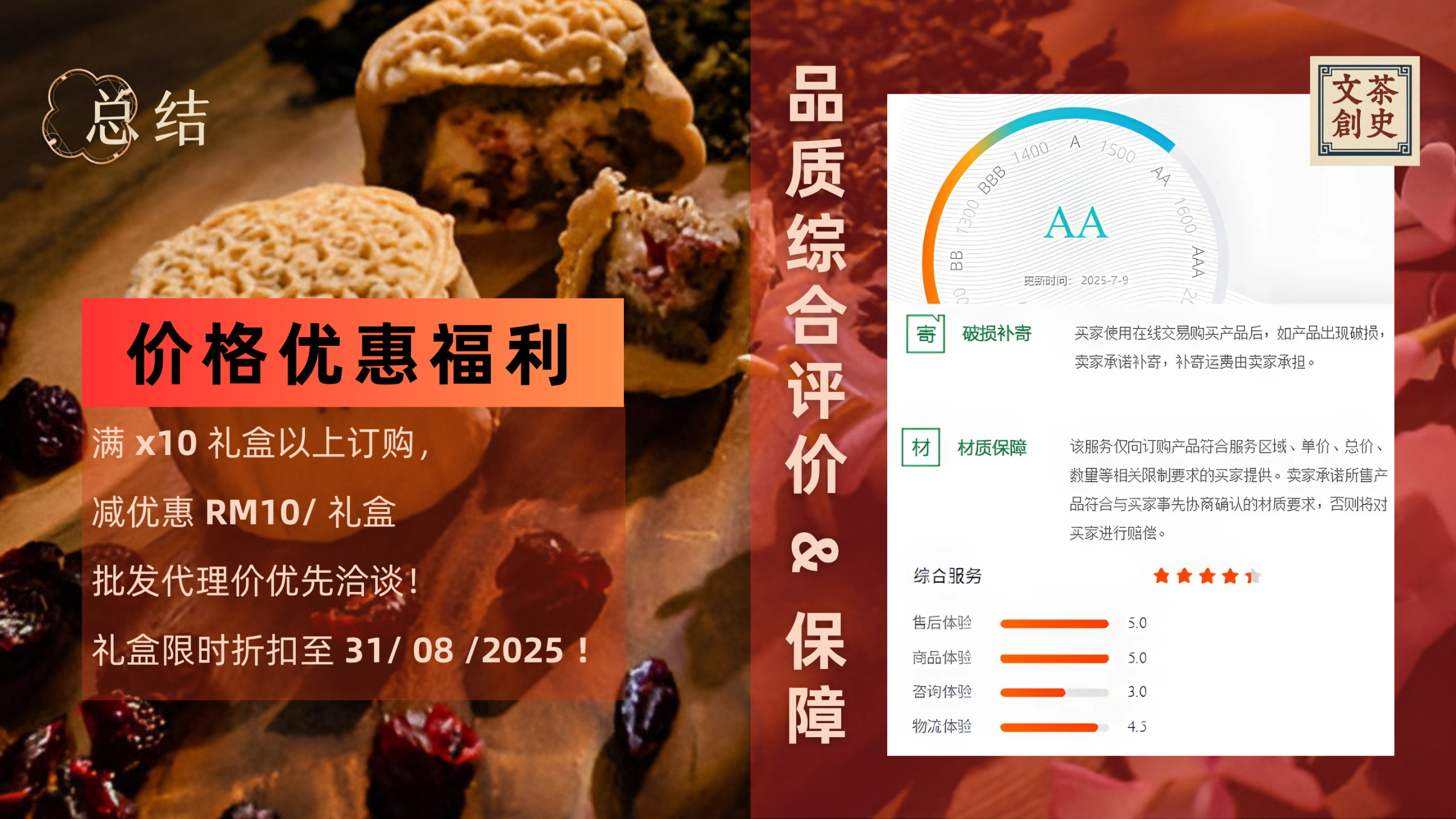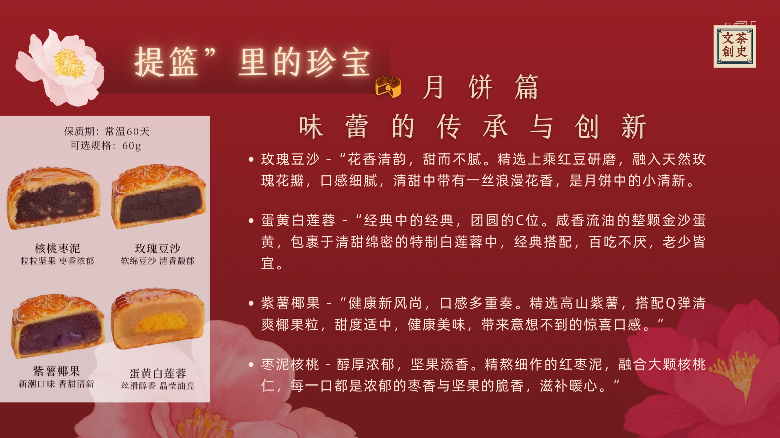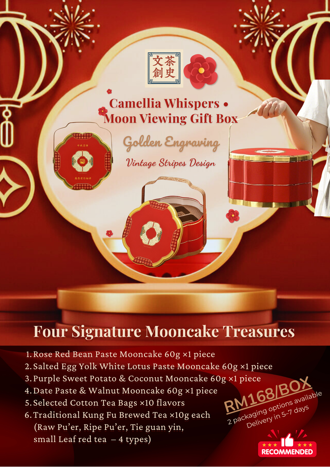 传统广式月饼系列 * 玫瑰豆沙 60g x1 粒 * 蛋黄白莲蓉 60g x1 粒 * 紫薯椰果 60g x1 粒 * 枣泥核桃 60g x1 粒 * 茶礼棉质优选袋泡茶 x10 款风味 * 传统功夫茶每款 10g(普洱生茶,普洱熟茶,铁观音,正山小种红茶 x4 款)