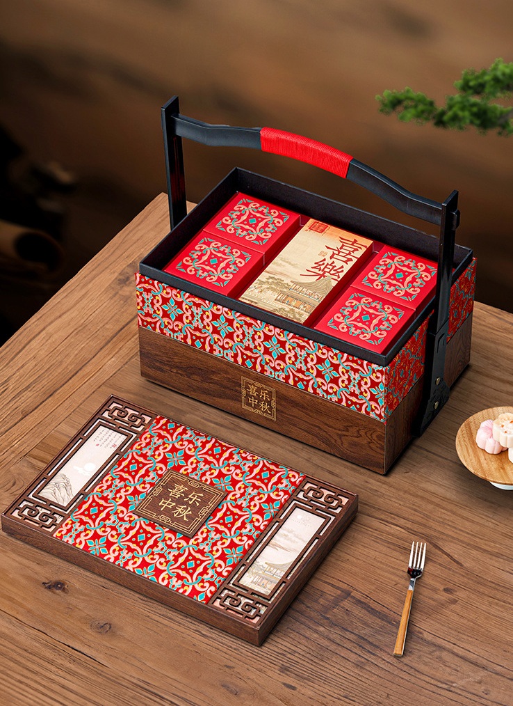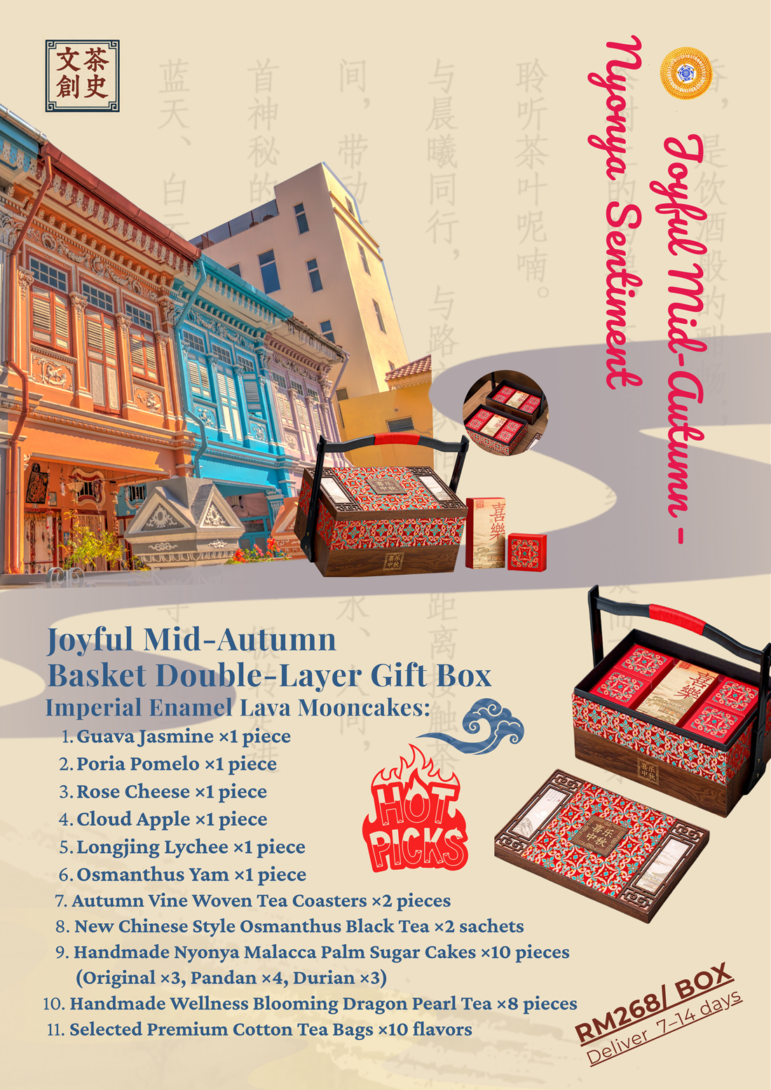 木质提篮双层捧手礼 * 宫廷珐琅流心月饼-番石榴茉莉 x1 粒 * 宫廷珐琅流心月饼-茯苓香柚 x1 粒 * 宫廷珐琅流心月饼-玫瑰乳酪 x1 粒 * 宫廷珐琅流心月饼-云山苹果 x1 粒 * 宫廷珐琅流心月饼-龙井荔枝 x1 粒 * 宫廷珐琅流心月饼-金桂淮山 x1 粒 * 秋藤编织茶垫 x2 片 * 新中式桂花红茶 x2 包 * 娘惹手作马六甲椰糖糕 x10 粒 (原味 x3, 斑兰 x4, 榴莲 x3) * 手作养生龙珠开花茶 x8 粒 * 茶礼棉质优选袋泡茶 x10 款风味